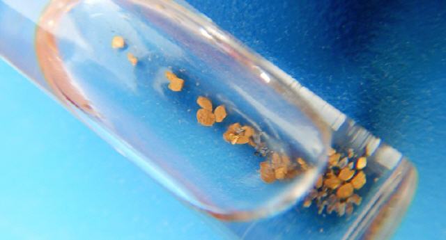 Dennoch konnten wir die Rinnen sogar einige Male befüllen und das darin eingefangene Konzentrat mit den Waschpfannen reinwaschen. Jeder der Teilnehmer nahm eine schöne Anzahl Goldstückchen mit nach Hause. Während die drei Konstanzer später pünktlich mit Beginn der Dämmerung den Rückweg einschlugen, mochten die zwei Berliner gar nicht aufhören und hätten den Tag am liebsten verlängert. Dummerweise wurde es dunkel. Uns blieb keine andere Möglichkeit, als den Weg zurück zum Waldparkplatz einzuschlagen. Dort war es bereits stockfinster. Beide versicherten, am nächsten Tag würden sie erneut herkommen und dann ihre heute erworbenen Kenntnisse in die Tat umsetzen. Wer weiß, vielleicht finden Sie ja den großen Goldklumpen…