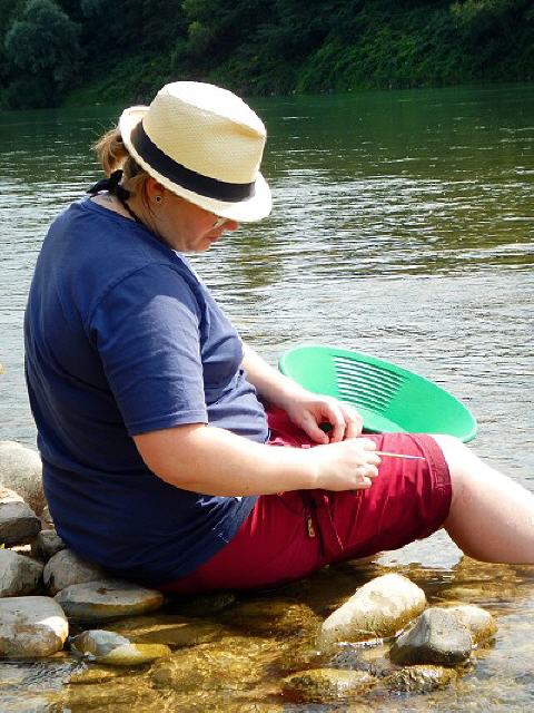 Nach der Einführung in die Arbeitsweise der Goldsuche waren etliche Teilnehmer nicht mehr zu bremsen, aus dem Grabungsloch im Flussbett den goldhaltigen Sand herauszuschaufeln. Die Goldwaschpfannen waren rasch gefüllt. Es dauerte nur kurze Zeit, bis das erste Goldflitterchen auf dem Pfannenboden glänzte. Voller Stolz wurde es mit einem Pinsel aufgenommen und in das mit Wasser gefüllte Glasröhrchen getupft. Und wie schön der Glanz war! Einfach fantastisch!