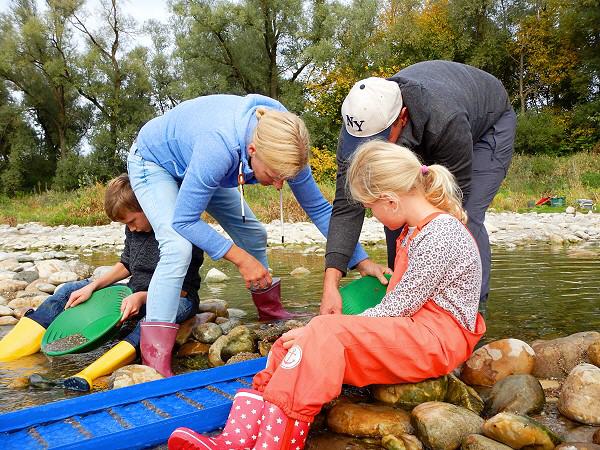 Besonderen Spaß hatten die Kinder. Mit großem Elan machten folgten die jüngsten Goldsuchern den Anweisungen, die Pfanne fest zu rütteln und den leichten Sand über den Rand fortzuspülen. Und damit Papa oder Mama selbst auch genug Gold waschen konnten, ließen es sich die Jüngsten nicht nehmen, möglichst alles alleine zu tun. Auch das Schaufeln.