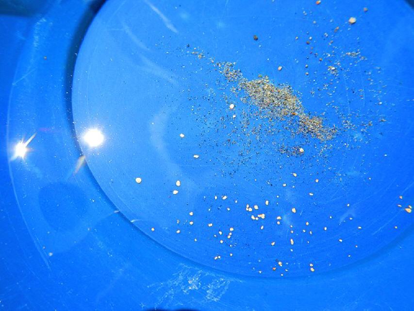 Rasch führte ich die Teilnehmer in die Waschtechnik ein, ehe alle Pfannen mit ausgesiebtem Sand gefüllt wurden. Bereits in der ersten Pfanne glänzte ein kleines Goldstückchen. Es war winzig klein, doch sein Glanz war prächtig. Zahlreiche weitere sollten folgen. Wer die Waschtechnik richtig anwandte, konnte eigentlich nur fündig werden. So kam nach und nach ein Goldflitterchen dazu.