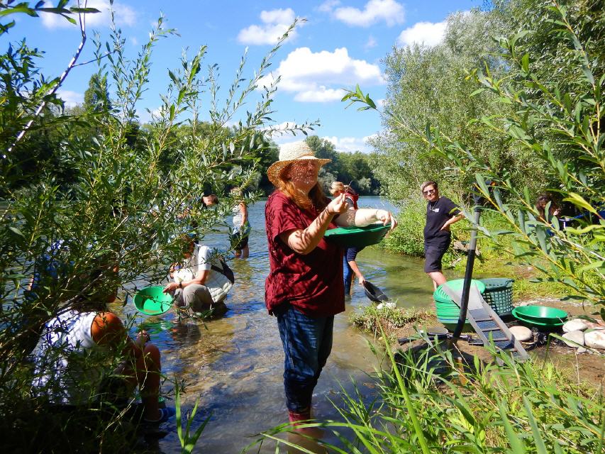 Ihren Spaß hatten ebenso die Kinder. Für die Kleinsten war der Umgang mit der Pfanne zu schwierig. Stattdessen konzentrierten sie sich auf die vielen schönen, bunten Steine. Andere sammelten kleine, weiße Muscheln ein. Muschelschalen kannten sie allenfalls vom Urlaub am Meer. Dass es sie auch hier gab, erstaunte dann doch sehr.