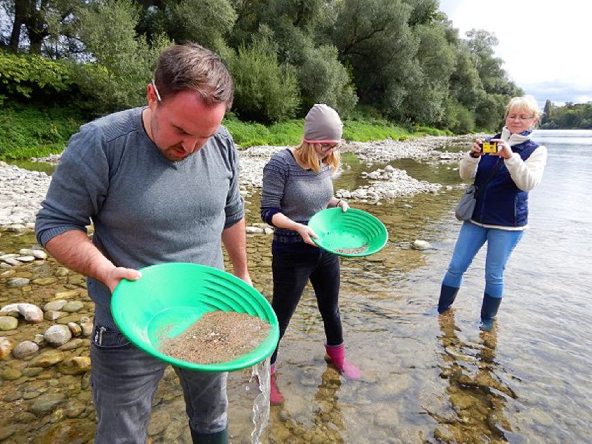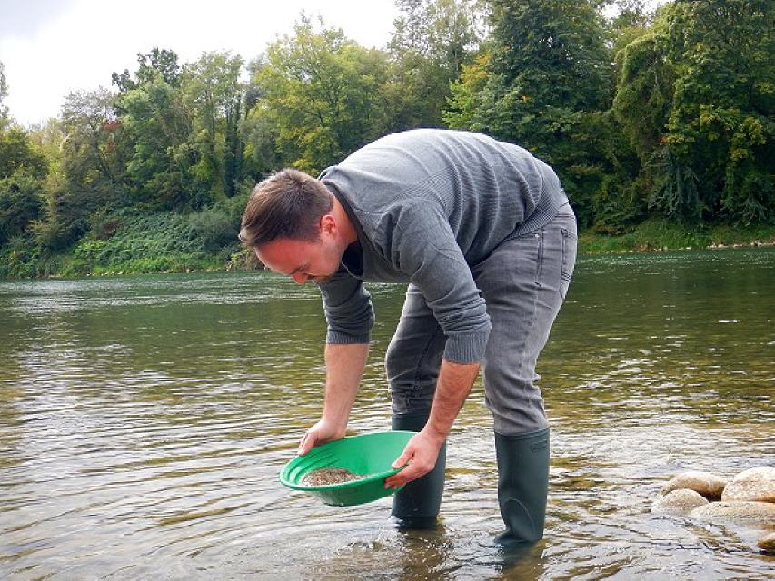 Erhöht wurde die Ausbeute am Nachmittag. Alle Teilnehmer beherrschten die Handhabung der Goldwaschpfanne mit Bravour, als wir nach der Grillpause eine der Goldwaschrinnen in die Strömung legten und sie mit ausgesiebtem Sand befüllten. Die Hauptarbeit übernahm die Rinne. In den Vertiefungen blieben die schweren Sande sowie die Goldstückchen liegen. Zuletzt ging es nur noch darum, das Konzentrat mit der Pfanne feinzuwaschen und die Goldplättchen an die Schürfer zu verteilen.