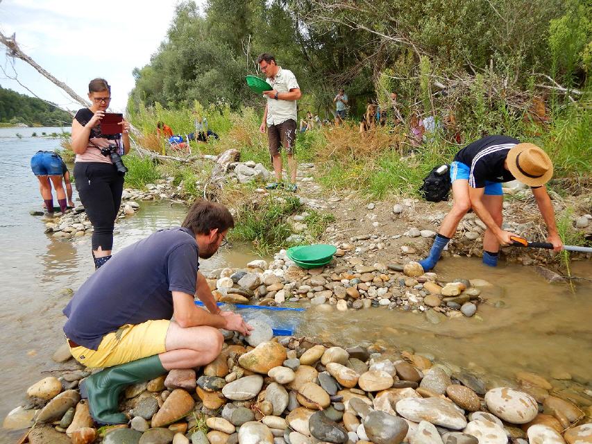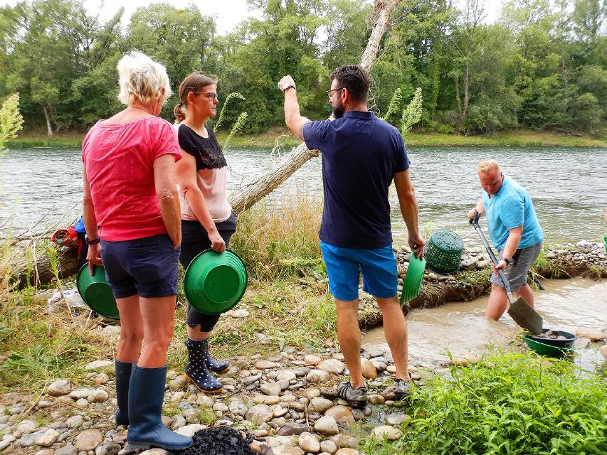 Schatten und gelegentlich ein erfrischendes Windchen! Das tut gut. Der Samstag war ganz anders als die bisherigen Goldwaschtage im ersten Halbjahr. Das Wetter war angenehm, der Himmel leicht bewölkt. So lief das Goldwaschen viel leichter "von der Hand". Und das, obwohl die Teilnehmerzahl ungewöhnlich groß war. Doch alle fanden ihr Glück, alle nahmen selbst geschürftes Rheingold mit nach Hause. Davon überzeugte sich sogar eine Journalistin, die ebenfalls am Goldwaschtag teilgenommen hatte.