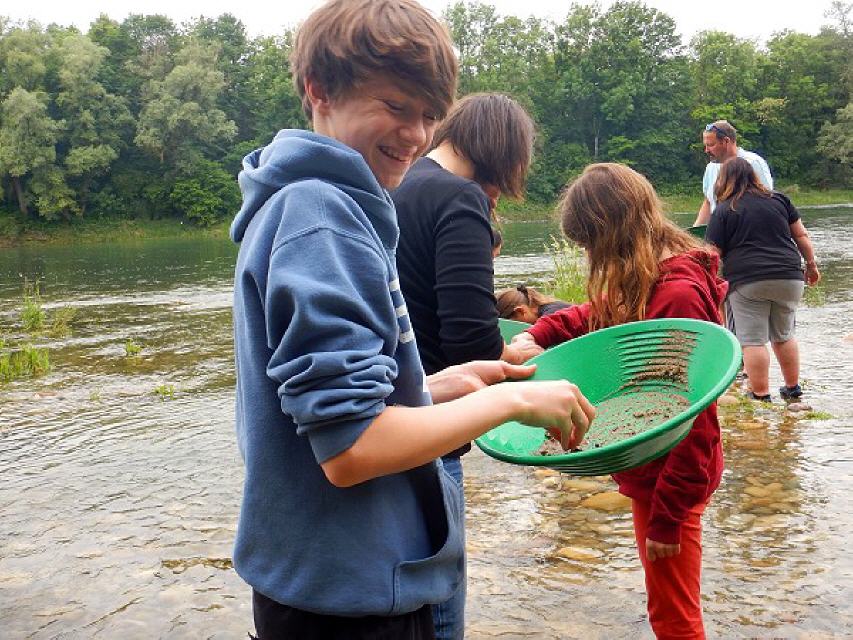 Übrigens, der für die Nachmittagsstunden angekündigte Regen blieb aus. Lediglich ein paar einzelne Regentropfen, vergleichbar mit einem kurzzeitigen Sprühregen, lockte uns für kurze Zeit unter das schützende Dach der Uferbäume. – An dieser Stelle mein herzliches Dankeschön an alle großen und kleinen Goldschürfer sowie an Steffi, von der ein Großteil der Bilder auf dieser Seite stammen.