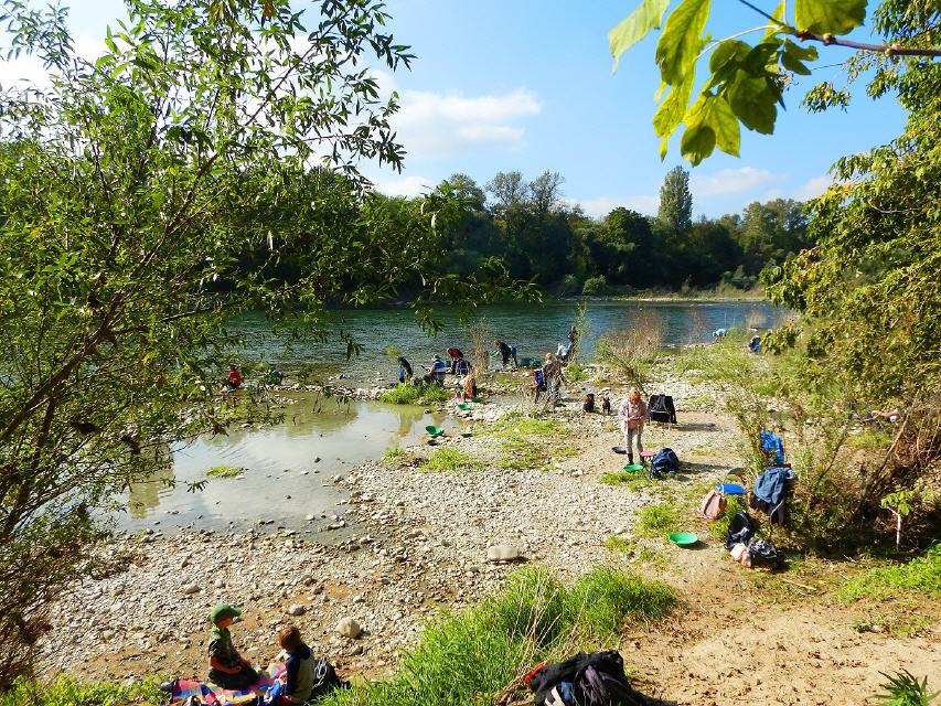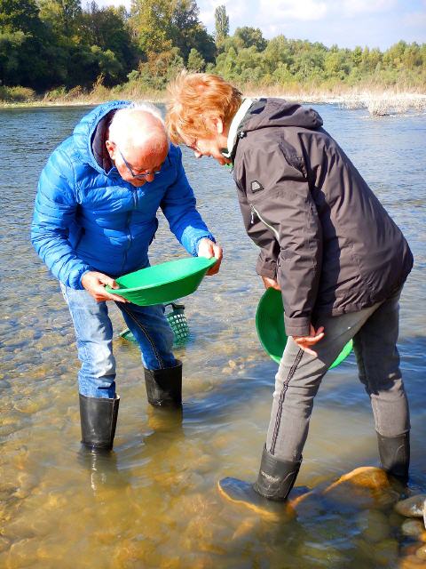 Zum wiederholten Mal war der kleine Leo dabei. Das Goldwaschen vor zwei Wochen hatte ihm so gut gefallen, dass er seine Mutter für einen zweiten Termin überredete. Diesmal konnte er sogar seine eigene Waschpfanne ausprobieren. Wie beim vorigen Mal ließ er sich auch nicht davon abhalten, im flachen Rheinwasser ein Bad zu nehmen. Seine Mutter hatte vorgesorgt und entsprechend viel Wechselbekleidung mitgenommen. Wechselbekleidung benötigte auch ich. Denn einmal schwamm eine Goldwaschpfanne davon. Im letzten Moment konnte ich sie vor dem Nimmerwiedersehen bewahren. Allerdings liefen nicht nur meine Stiefel voll Rheinwasser, sondern auch ein gutes Stück meiner Jeans war untergetaucht. Gut, dass Goldsucher immer zusätzliche Bekleidung im Gepäck haben...