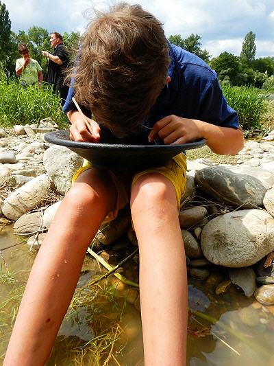 Gleich nach der gemeisamen Mittagspause, die ich mit einigen Geschichten rund ums Rheingold bereicherte, wurden die Waschpfannen zur Seite gelegt und die Waschrinnen genutzt. Sie sollten die Fundmenge deutlich erhöhen. Dazu wurde wie anfangs der Sand zwischen den Steinen herausgesiebt und zu den Waschrinnen gebracht. Dort verfing sich das Gold in den tieferen Rillen. Letztlich musste lediglich noch das eingefangene Konzentrat mit der Pfanne reingewaschen werden.