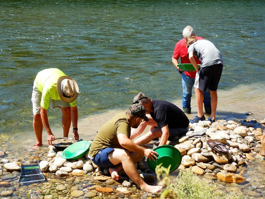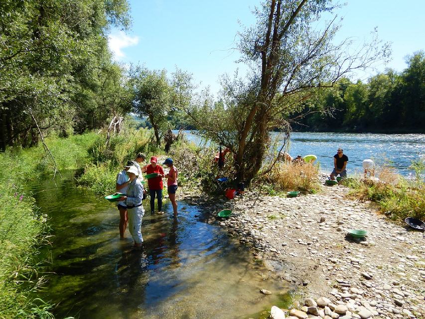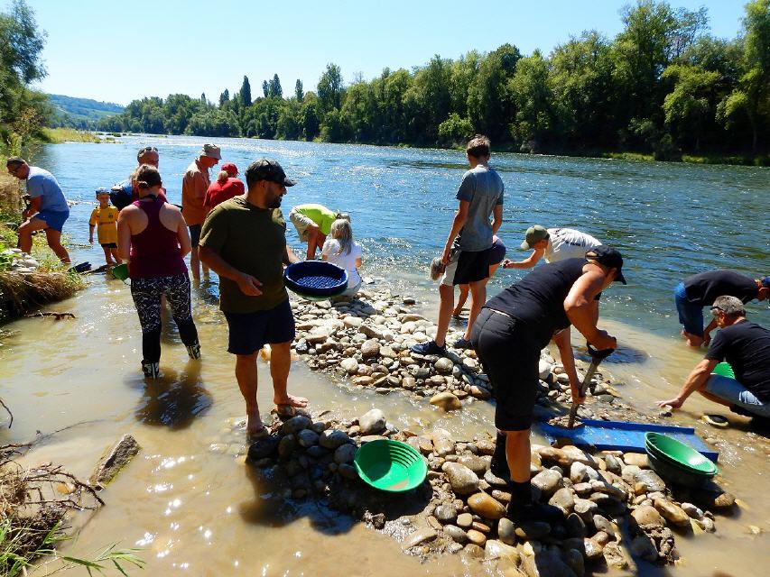 Für Steffi und mich (Franz) war es wieder einmal ein sehr schöner Goldwaschtag mit super netten, fleißigen Teilnehmern. Ein paar von ihnen hatten sogar eigene Pfannen und Schaufeln mitgebracht. Das zeigte uns, dass einige sicherlich nochmals auf Goldsuche gehen möchten. Und einen der guten Goldwaschplätze lernten sie ja im Rahmen des Kurses kennen. Sie erfuhren aber auch, Goldschürfen ist keine bequeme Arbeit. Um Rheingold zu finden, muss fleißig geschaufelt, gesiebt und die Pfanne geschwenkt werden. Je mehr, umso besser.