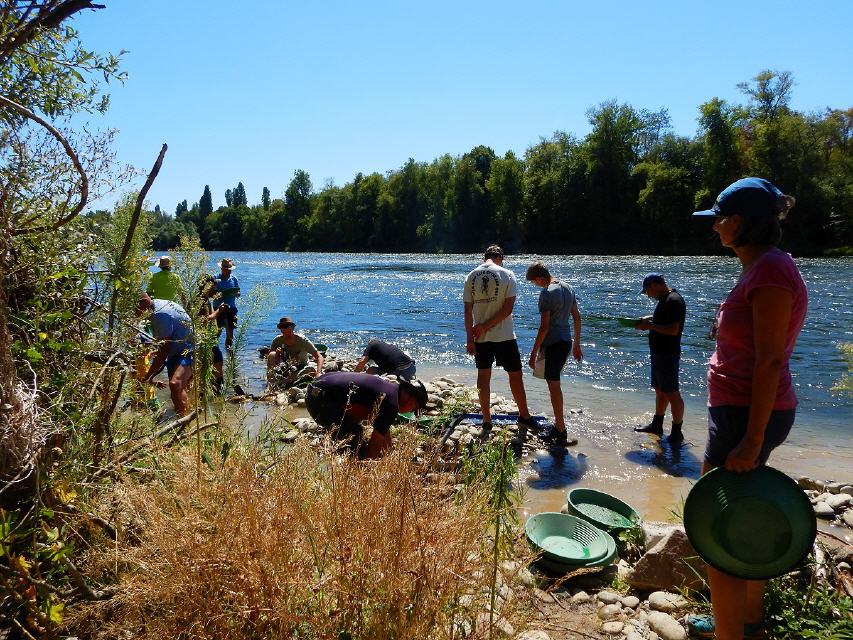Im Gegensatz zu anderen Goldwaschplätzen hat das Hochwasser die Geröllbank hier "verdreht", so dass selbst in tiefen Schichten eine dicke Lehmschicht liegt. Die jetzt tieferen Schichten waren ursprünglich oben. Das ist ungewöhnlich. Die Teilnehmer dieses Waschkurses bekamen dies durch einen ungewöhnlich hohen Anteil an Lehm zu spüren. Aber dieser Lehm enthält auch Gold, was mit dem letztjährigen Hochwasser darin angereichert wurde.