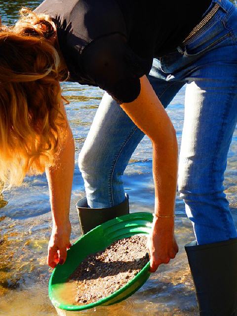 Später wurden noch die Waschrinnen in die Strömung eingesetzt. Mit ihnen wird die Goldausbeute nochmals erhöht. Das in den Rillen festgehaltene Konzentrat, bestehend aus schweren Mineralien (und damit auch Gold) musste lediglich noch mit den Pfannen reingewaschen werden.