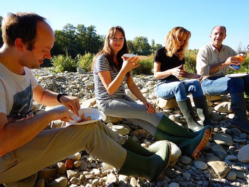 Klar, dass wir die Mittagspause direkt auf der Geröllbank und nicht – wie üblich – unter einem der schattenspendenden Laubbäume verbrachten. Sie wurde dazu genutzt, ihnen weitere Informationen über die Herkunft des Rheingoldes und seine Entstehung zu vermitteln, ebenso was es mit der Goldlinie auf sich hat.