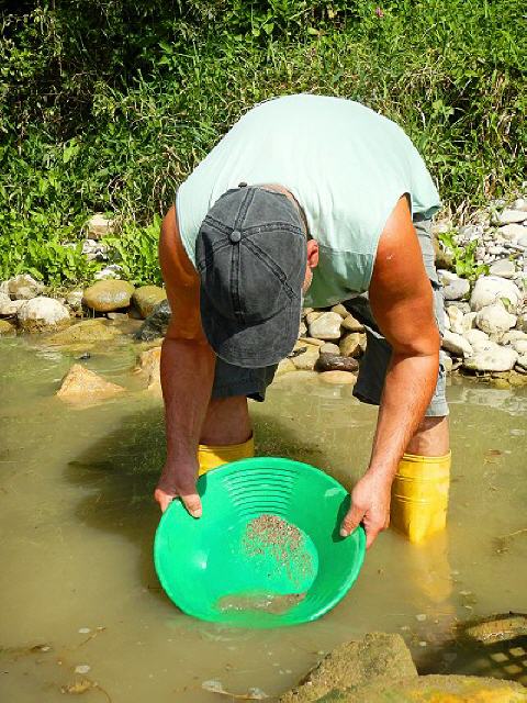 Schon in der ersten Pfanne blinkten zwei Goldstückchen auf. Sie waren noch winzig, ließen aber auf das Vorhandensein weiterer und größerer Flitter schließen. Auch die Begleitmineralien und insbesondere der “schwarze Sand” waren ausreichend vorhanden. Der “schwarze Sand” ist Magnetit. Dieses Eisenmineral zählt zu den Schwermineralien und lässt Rückschlüsse auf andere besonders schwere Bestandteile wie Beispielsweise Gold zu.
