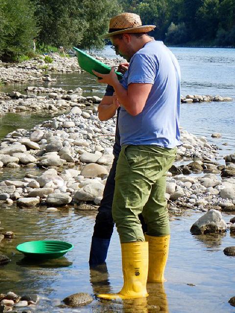 Nachdem ich den Teilnehmern das theoretische Rüstzeug vermittelt und ein Probewaschen absolviert hatte, wurden die Pfannen aller Teilnehmer gefüllt. Dann ging es daran, die richtige Waschtechnik einzuüben. Während die einen dabei keinerlei Schwierigkeiten hatten und schon recht früh ihr erstes selbst geschürftes Rheingold auftupfen konnten, zeigten sich bei anderen Probleme. Vor allem die Haltung der Waschpfanne, das Schütteln und Schwenken machte ihnen Schwierigkeiten. Zumeist waren sie zu vorsichtig und scheuten sich davor, die leichten Sande über den Pfannenrand fortzuspülen. Mit ein wenig mehr Mut und Gelassenheit funktionierte es dennoch.