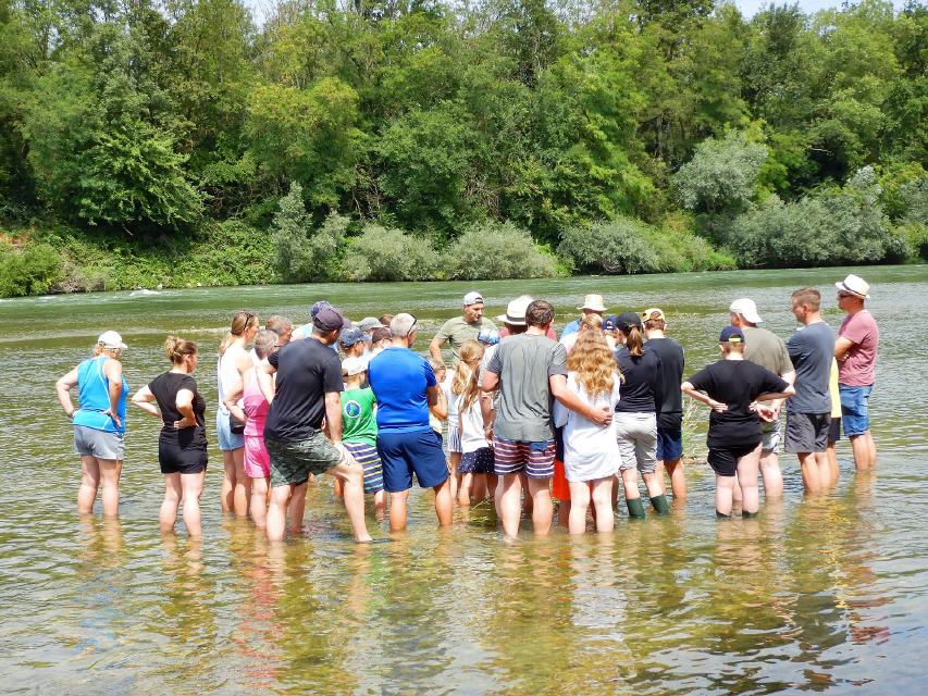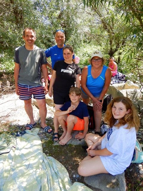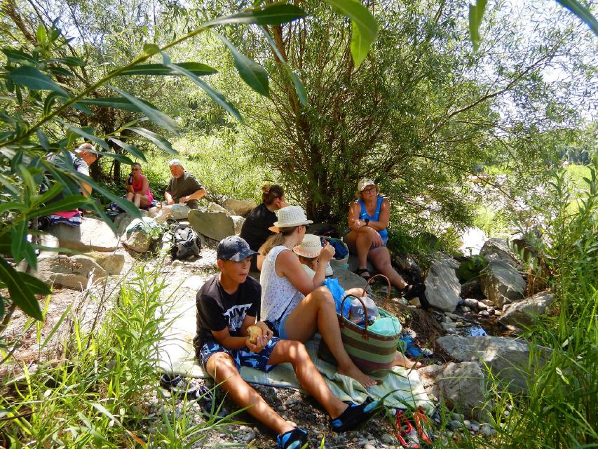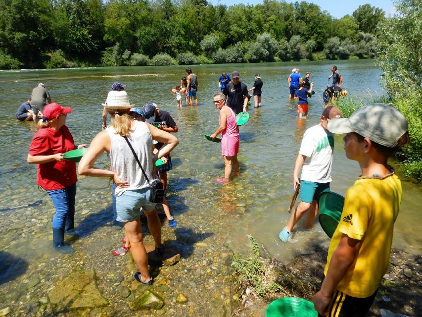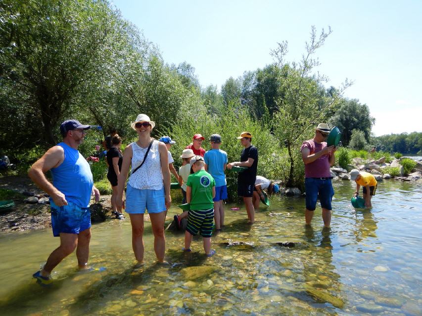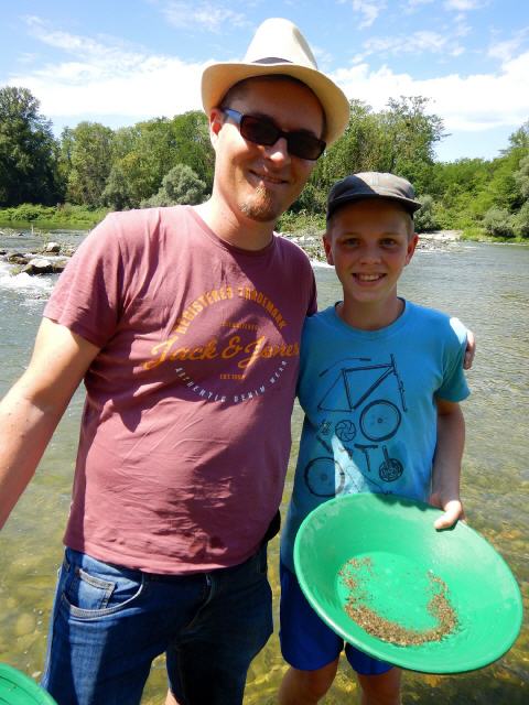 Heiß, heißer, am heißesten. Goldwaschen erfordert viel Muskelkraft und zugleich Ausdauer. Doch wenn das Thermometer auf über 30 Grad Celsius steigt, wird's etwas schwierig. Pausen und Schatten sind dann angesagt, sich immer mal wieder eine Ruhepause gönnen und einfach nur die herrliche Flusslandschaft genießen. Während die Kinder das niedrige Wasser gerne zum Planschen und Herumtollen nutzten, zogen sich ihre Eltern immer mal wieder unter die schattenspendenden Bäume zurück, gönnten sich eine Erfrischung, um gestärkt dann wieder das Werkzeug anzupacken und Sand und Kies in das Sieb zu schaufeln. Dabei machte es der Untergrund uns allen nicht gerade leicht. Der Boden des nicht einmal knietiefen Flussbettes war verdichtet.
