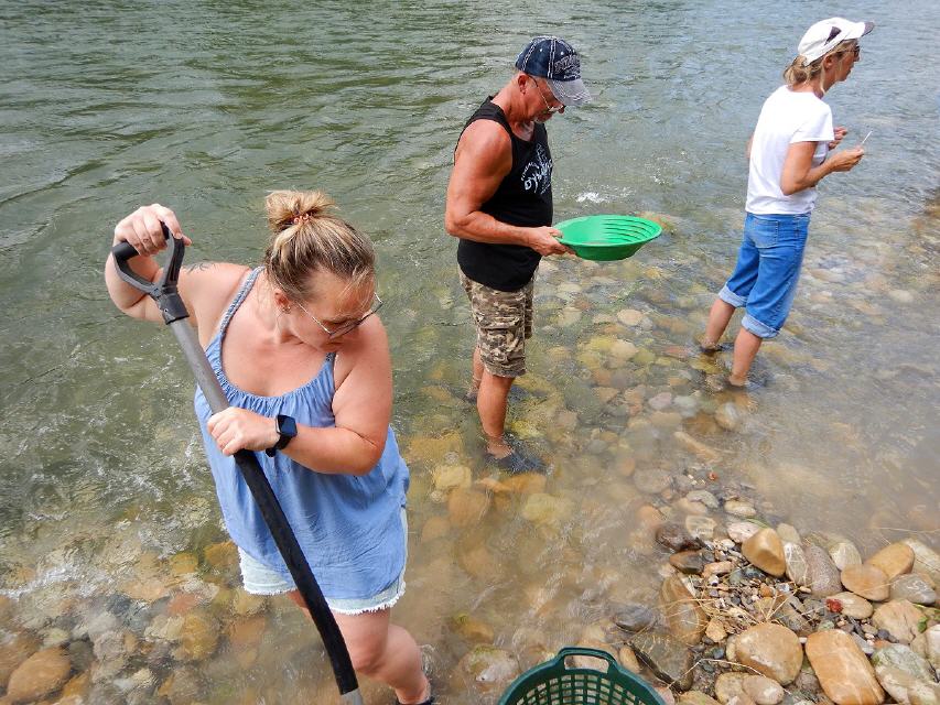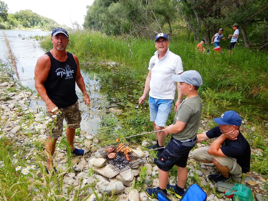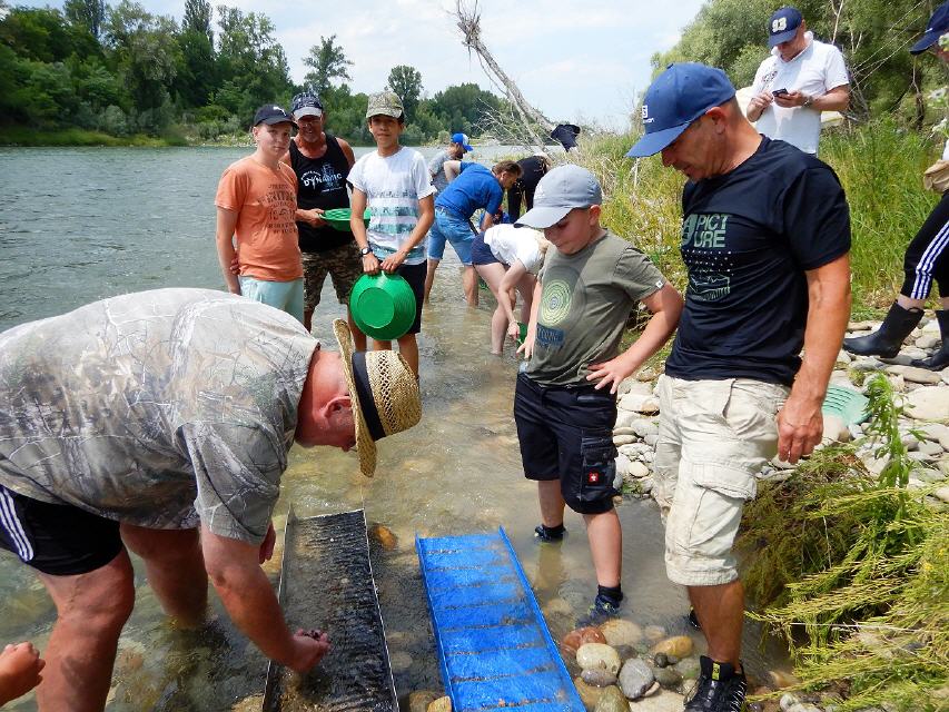 So heiß wie in diesem Juni hatten wir es schon lange nicht mehr. Ein Glück, dass am neuen Goldwaschplatz mächtige Laubbäume direkt am Ufer Schatten spendeten. Bereits am Vortag war ich (wieder mal) vor Ort. Die Kontrolle war auch nötig, denn seit dem letzten Besuch hatte sich vom Zugang Dammweg bis zum Rheinufer ein dichter Brennesselwald gebildet. Es hatte einige Zeit beansprucht, um einen Pfad zu schlagen und zum Ufer zu gelangen. Davon profitierten wir nun am Goldwaschtag. Am Ufer endlich angekommen, kühlten viele zunächst ihre Füße im erfrischenden Nass des Flusses, während Steffi und ich (Franz) das Lager einrichteten und die Einführung hielten. Denn wer Gold finden und mit nach Hause nehmen will, sollte den richtigen Umgang mit Pfanne und Schaufel kennen. Die Praxis folgte gleich danach, indem alle die Schaufeln in die Hand nahmen, Sand und Kieselsteine in das Sieb warfen, es kräftig rüttelten, damit die Sande in die darunter liegende Pfanne fiel. Der eigentlich Waschvorgang erfolgte anschließend mit der Pfanne. Die Teilnehmer waren fleißig bei der Sache, übten den richtigen Umgang, das Rütteln und Schütteln, um letztlich die leichten Sande über den Pfannenrand fortzuspülen. Wer richtig hantierte, entdeckte bald auf dem Pfannenboden den begehrten "schwarzen Sand" (Magnetit) - und mit etwas Glück bereits die ersten Goldflitterchen.
