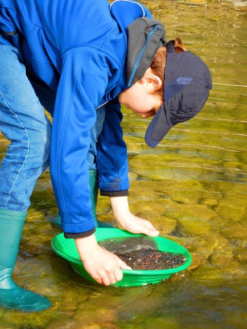 - Johannes und Tanja K. aus Eisenbach: Hallo Franz und Steffi, gespannt, was bei dem Goldwaschtag auf uns zukommt, fuhren wir nach Bad Bellingen. Alle Teilnehmer trafen sich, bevor wir noch ein kurzes Stück zum Parkplatz fahren mussten. Nach einem kurzen Weg zu Fuß kamen wir am Goldwaschplatz an und konnten schon zu Anfang den Rhein bestaunen. Schon bald kam die Sonne heraus, ließ das Wasser glitzern und bescherte uns einen schönen und warmen Herbsttag. Als alle Hilfsmittel ausgepackt waren, machte uns Franz das ganze Prozedere einmal vor: Flussmaterial in die Pfanne schaufeln, sieben, und mit etwas Glück einige Goldpartikel finden. Anschließend durften wir selbst an die Arbeit gehen, wobei man schnell merkte: So einfach, wie es aussieht, ist es nicht! Nach einigen Versuchen und Hilfestellungen klappte es jedoch ganz gut und man konnte immer mal wieder Gold finden. Zwischendurch gab es noch eine Pause, um sich zu stärken, wonach es aber gleich weiter ging. Schnell war der Tag zu Ende und wir verabschiedeten uns. Es machte uns viel Spaß und faszinierte uns, wie vorsichtig - und doch nicht zu vorsichtig - man mit der vollen Pfanne umgehen musste, damit man am Ende Erfolg hatte. Es war die Mühe auf jeden Fall wert und wir konnten glücklich und mit einem fröhlichen Grinsen nach Hause gehen. Liebe Grüße und vielen Dank, Johannes und Tanja