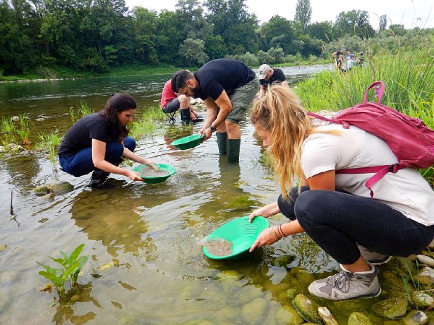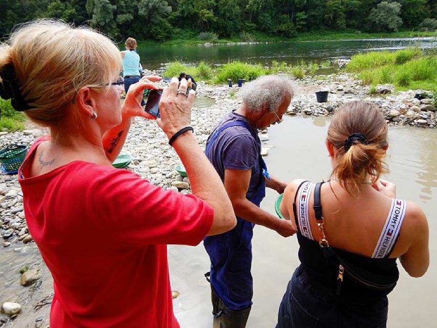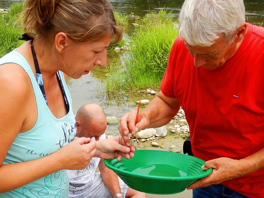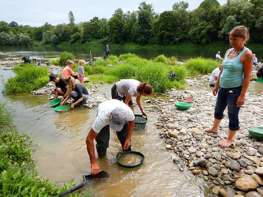 Dass das Goldwaschen kräftezehrend sein kann, spürten die Teilnehmer von Beginn an. Denn wer Gold finden will, muss zunächst den edelmetallhaltigen Sand in ein Sieb schaufeln und diesen anschließend von den groben Kieselsteinen trennen. Genau diesen Teil der Goldschürferei durfte ich (noch) nicht ausführen. Meine Freunde Wolfgang und Hans hatten glücklicherweise vor Tagen mitgeteilt, einzuspringen, Sand zu erschaufeln und vorzusieben. Das Gold aus den Pfannen waschen, das mussten die Teilnehmer dann selbst übernehmen.