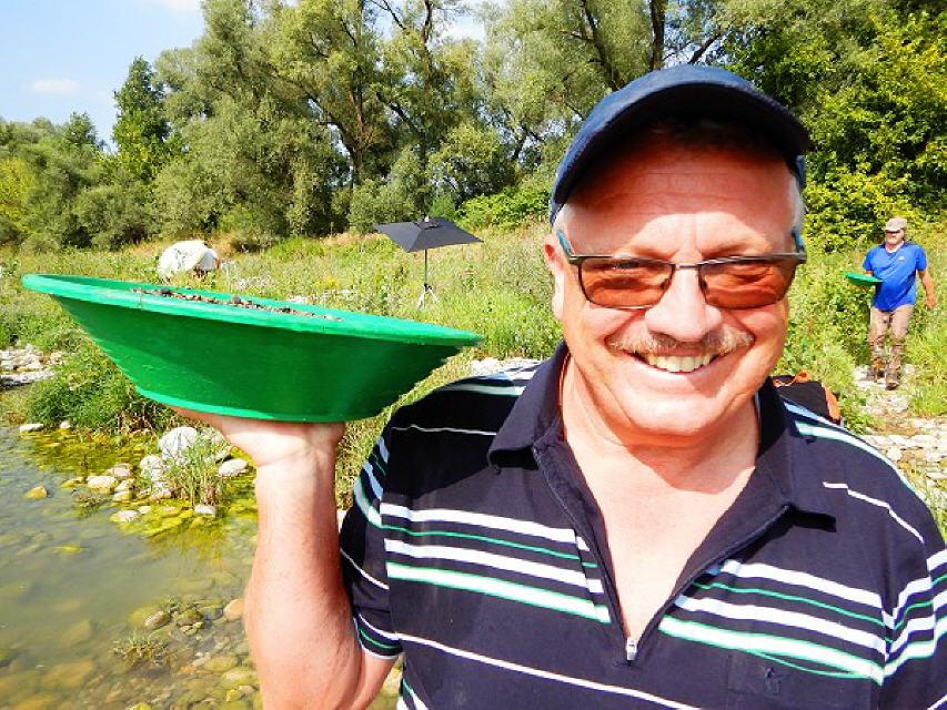 Wer das seltene Edelmetall haben möchte, muss sich darum bemühen: Zunächst muss der zwischen den großen Kieselsteinen haftende Sand gewonnen, gesiebt und nach seiner physikalischen Dichte sortiert werden. Das erfordert einige Kenntnisse im Umgang mit der Waschpfanne. Wer den Dreh raus hat, wird ziemlich rasch die Goldstückchen auf dem Pfannenboden aufblitzen sehen. Bis dahin braucht es allerdings einiges an Übung.