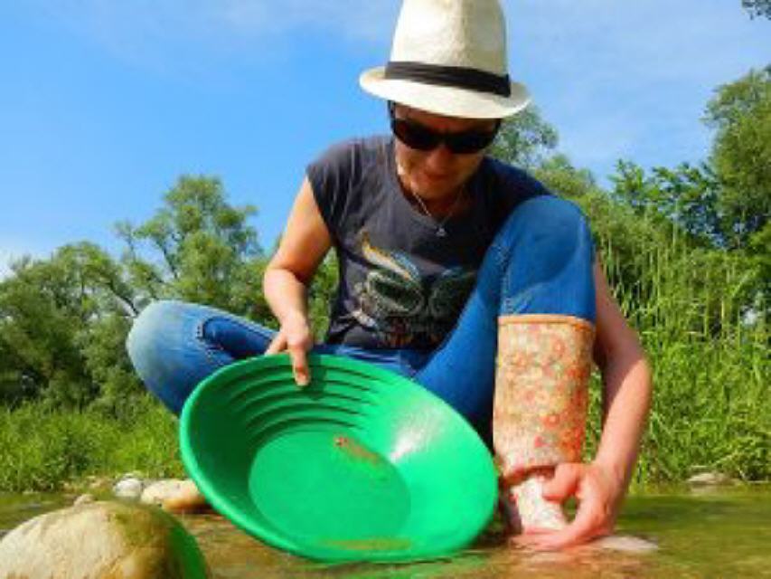Doch bevor wir die richtige Waschtechnik einüben konnten, musste erst einmal ein wenig Theorie vermittelt werden. Gold ist bekanntlich sehr schwer, der übrige Sand dagegen sehr leicht. Im Grunde geht es darum, die leichten Sande von den schweren zu trennen und daraus das Gold zu extrahieren. Das hört sich logisch an, funktioniert (rein theoretisch) ziemlich einfach – allerdings erst nach einiger Übung. Das richtige Schwenken und Rütteln der Pfanne ist eine Kunst, die erst erlernt werden muss.