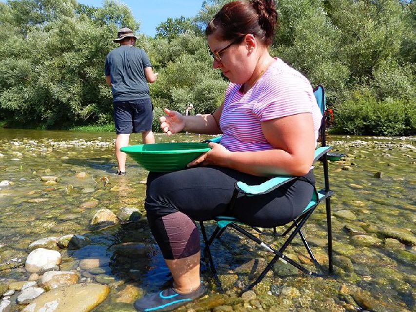 - Dominik und Elena H. aus Muggensturm: Unsere Erwartungen wurden weit übertroffen! Der Waschplatz war nicht nur wegen den Goldfunden toll gewählt. Ein schattiges Plätzchen am Ufer und das flache, fast schon warme Wasser haben das Goldwaschen zu einem tollen Familienerlebnis werden lassen. Auch wenn wir wohl doch nicht reich geworden sind, hat sich am Ende des Tages ein hübsches kleines Häufchen Goldflitter am Boden unseres Glasröhrchens angesammelt.