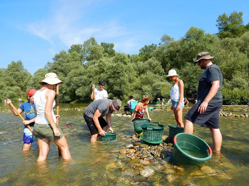 Natürlich wurde an diesem Goldwaschtag nördlich von Neuenburg nicht nur nach Gold geschürft; die Mittagspause bot eine gute Gelegenheit, die Funde zu bestaunen und nebenbei noch viel Wissenswertes über das Rheingold zu vermitteln.