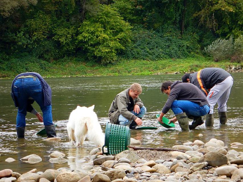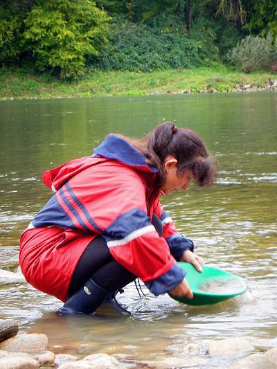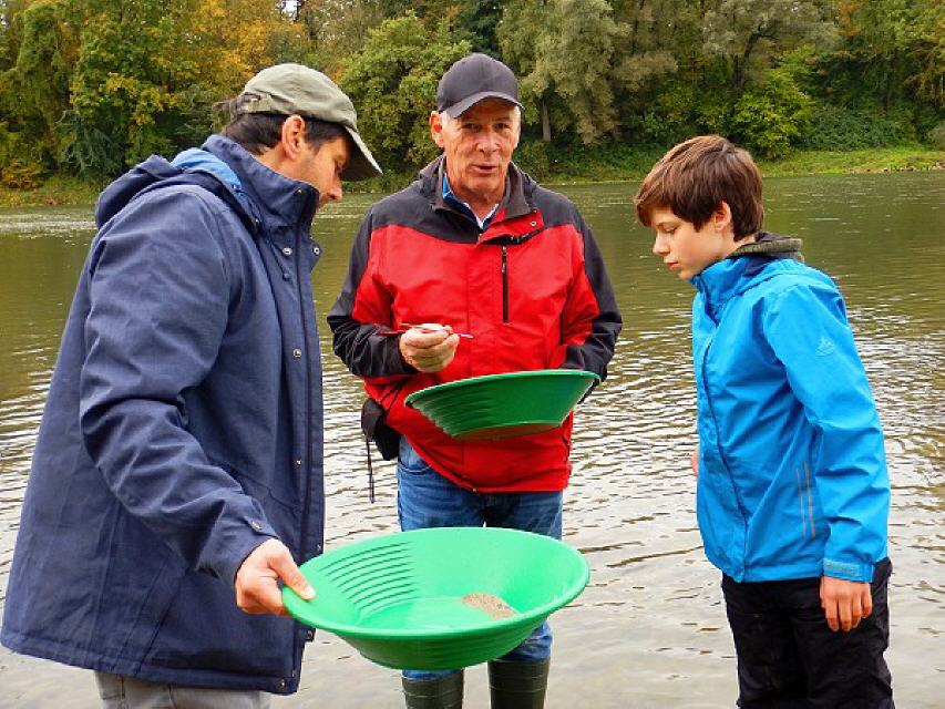 Die Teilnehmer waren von Anfang an tatendurstig und wollten so rasch wie möglich erfahren, wie Goldsucher das seltene Metall aus dem Rheinsand waschen, weshalb es ausgerechnet hier häufiger vorkommt als woanders und wo das Gold seinen Ursprung hat. So viele Fragen während des ganzen Tages durfte ich schon lange nicht mehr beantworten. Pausenlos.