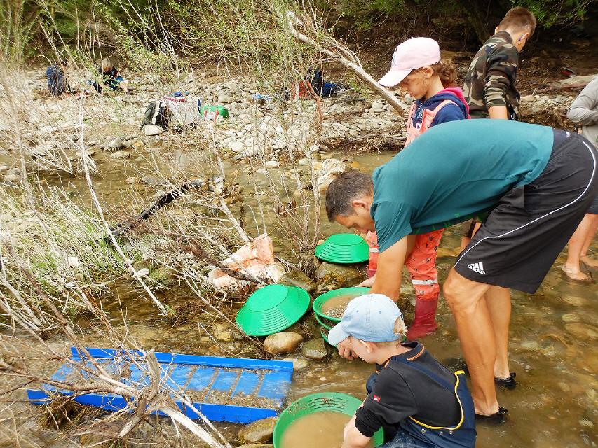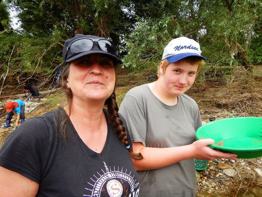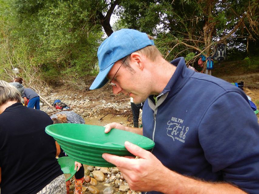 Die Teilnehmer waren mit Eifer bei der Sache, schaufelten die oberen Sand- und Geröllschichten frei, um an den begehrten, goldhaltigen Sand zu gelangen. Dieser musste lediglich reingewaschen werden. Was sich so einfach anhört, gestaltet sich in der Praxis dann doch etwas komplizierter. Denn es erfordert ein wenig Übung, den richtigen Dreh herauszubekommen, bis endlich nur noch die schweren Sande in der Pfanne verbleiben, während die leichten über den Pfannenrand fortgespült sind. Abschließend genügt ein leichter Schwenk, bis der darunter liegende "schwarze Sand" (Magnetit) auf dem Pfannenboden haften bleibt. Mit etwas Glück tauchen darin Goldflitterchen auf. Manchmal sind es sogar mehrere.