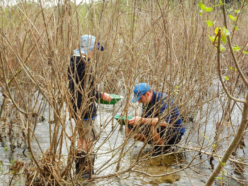 Ja, wir hatten wirklich Glück. Das Wetter war (wie meistens hier im äußersten Südwesten) weitaus besser, als es die Wetterfrösche vorausgesagt hatten. Und auch die Temperaturen waren angenehm. Rasch führten wir die Teilnehmer zum Goldwaschplatz. Dort waren die Folgen des wochenlangen Hochwassers noch immer deutlich zu sehen. Der schmale Pfad durch den Rheinwald war ausgewaschen, hoch in den Baumzweigen hingen Grasbüschel herunter und die tiefer stehenden Weiden trugen fast keine Blätter. Überall ragten Wurzeln aus dem Boden. Das Hochwasser hatte ganze Arbeit geleistet.
