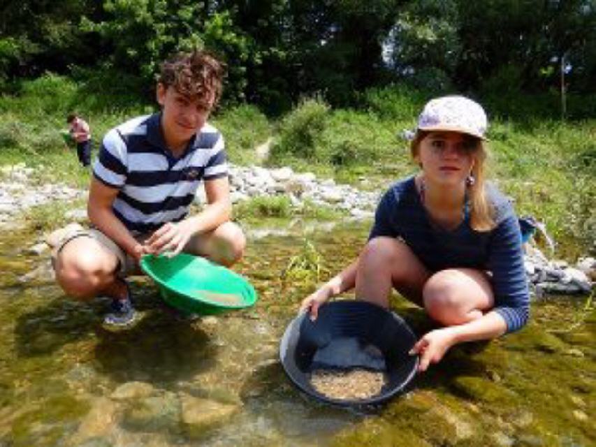 Unter franzkundiger Anleitung wurden fleißig die Pfannen geschwenkt und siehe da – die ersten Flitterchen Gold blitzten in der Sonne und wurden schnell in den Tresor gepinselt.