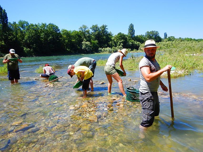 Der Goldwaschtag begrüßte uns auch heute mit einem herrlichen Sonnenschein. Einige hundert Meter oberhalb unserer Schürfstelle bot sich ein atemberaubendes Naturschauspiel: Der Rhein schäumte über die Isteiner Schwellen. So bot sich uns ein spannender Tag – mit schönen Goldfunden und einem einmalig schönen Erlebnis.