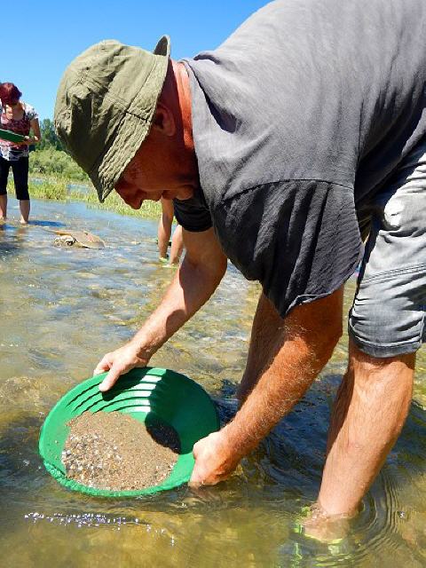 Und darum ging es in diesem Goldwaschkurs: um die Kunstfertigkeit, mit der Pfanne die Goldplättchen herauszuwaschen. Dabei nutzen Goldsucher die unterschiedliche Dichte der Mineralien. Im Grunde geht es darum, das im Sandgemisch verborgen liegende, sehr schwere Gold nach unten auf die Bodenplatte zu bewegen, während die leichteren Bestandteile über den Pfannenrand rausgespült werden. Die Teilnehmer meisterten dies mit Bravour und konnten letztlich etliche Goldstückchen mit nach Hause nehmen.