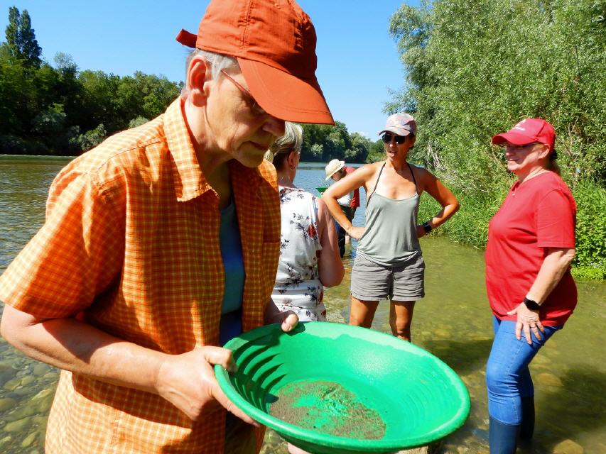 Dann - nachdem wir die Gruppe zur Mittagspause unter die schattigen Bäume zusammengerufen hatten, wo wir den Teilnehmern nebenbei etliches über die Herkunft des Rheingoldes, die Eigenschaften des edlen Metalles und etwas aus der Geschichte der Rheingoldsucherei berichteten - änderte sich alles. Es war just der Moment, als unser Freund Wolfgang "Goldbolle" vorbei kam. Er hatte beschlossen, mit uns gemeinsam zu schürfen sowie sein Fachwissen mit den Teilnehmern zu teilen. Einfach nur so. Geplant war das nicht.