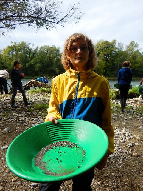 Ein Teilnehmer machte heute einen ganz besonderen, seltenen Fund. In seiner Pfanne entdeckte er ein kleines Stückchen Quarz, durch das eine Metallspur führte. Und darin war kristallinies Gold enthalten. Zunächst dachte er, es handle sich um ein Stück "Katzengold", doch Steffi bestätigte ihm nach einer intensiven Begutachtung sein Goldstück. Berggold, das noch im Gestein ist, kommt nicht in Form von Flitterchen vor, sondern ist kompakt. Zerbrochene Kieselsteine mit kleinen Goldadern darin sind sehr selten.