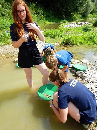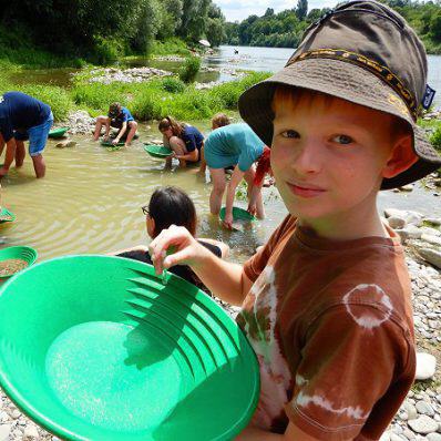 Nachmittags ging das Gewusel weiter. Jetzt wurden die Waschrinnen eingesetzt. Dazu musste von der Grabungsstelle Sand zu den Rinnen transportiert werden. Alle machten eifrig mit. Als Belohnung wurde die Goldausbeute wiederholt.