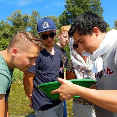 Schon recht früh und unmittelbar nach einer kleinen Pause unter schattenspendenden Rheinwaldbäumen ging’s gleich wieder an die Arbeit. Jetzt wurden die Waschrinnen eingesetzt, denn schließlich wollten sie ja auch die Arbeitsweise dieser Geräte erfahren. Und wieder ging es ans Schaufeln. Die Studenten waren dabei derart eifrig bei der Sache, dass es mir nur einige wenige Male gelang, eine der Schaufeln zu erobern. Alle Achtung!