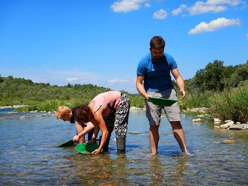 Und dann waren natürlich die praktischen Übungen. Gold ist ein extrem schweres Edelmetall. Entsprechend eigenwillig verhält es sich im Geschiebe, versteckt sich gerne in den tieferen Sedimenten und lässt sich nur mit einigen Tricks aus dem Sand gewinnen. Dazu zählt als erstes, die obersten Kieselsteine vom Flussgrund entfernen, bis man auf eine feste, verdichtete Schicht stößt. Sie zu durchbrechen erfordert ziemlich viel Muskelkraft.