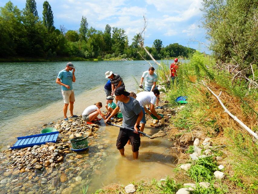 Dabei hatten wir kaum eine Pause eingelegt. Wir (Steffi und ich, Franz) waren ununterbrochen im Einsatz, zeigten den richtigen Umgang mit der Waschpfanne, die Funktionsweise der Goldwaschrinne oder halben mit, dass beim Pfannenschwenken das Gold nicht zurück in den Rhein geschwemmt wurde. Besonders Steffi war heiß gefragt. Ständig standen große und kleine Goldsucher um sie herum, damit sie nach dem Auswaschen noch einmal den Pfanneninhalt inspizierte, um auch wirklich das allerletzte Goldflitterchen herauszuholen.
