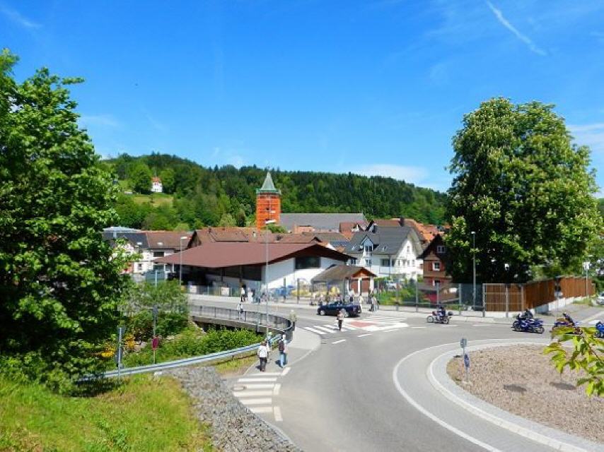 Start ist beim Bahnhof in Elzach. Von dort aus geht es auf die andere Talseite hinüber quer durch die kleine Elztalstadt. Wir folgen der blauen Raute Richtung Ortsmitte bis zum “Goldenen Löwen” und biegen dann links ab. Nach einem steilen Anstieg gelangen wir zur Neunlindenkapelle.