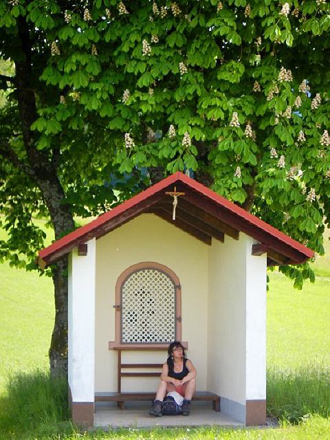 An der Wegegabelung liegt die kleine Pfaffenkapelle. Im Schatten der Kapelle und der riesigen Kastanie bietet sich abermals eine Rast an. Vom Elztal ist hier oben nichts mehr zu sehen, nur die Schwarzwaldberge, Wälder und Wiesen…