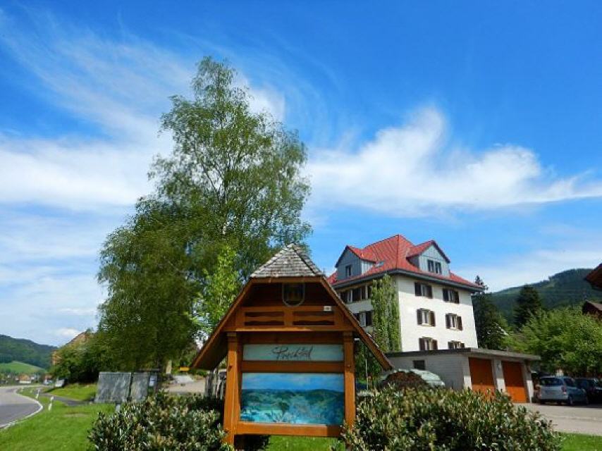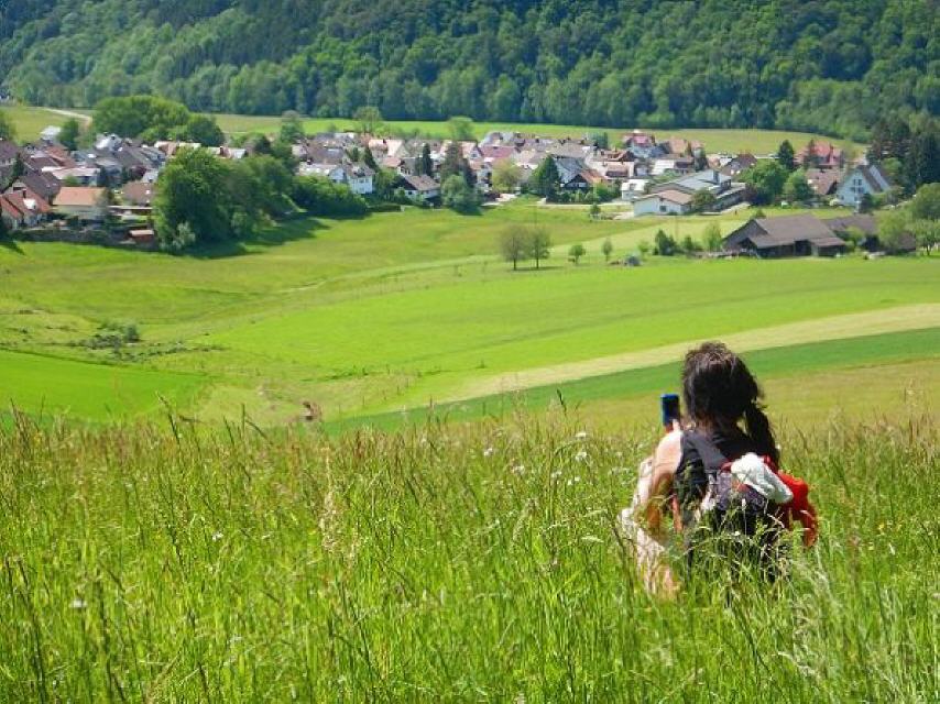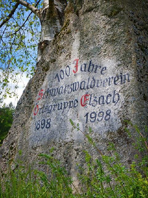 Gleich dahinter steigen wir durch den Wald zur Elz hinab, folgen dem Flüsschen aufwärts bis zur Überquerung bei den Schrahöfen. Dort dem Hinweisschild folgen, die Schule und das Rathaus passieren und steil den Berg hinauf. Oben gönnen wir uns erst einmal eine Rast und blicken ins Elztal hinab.