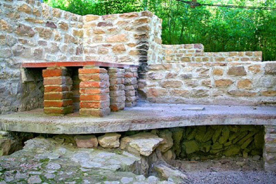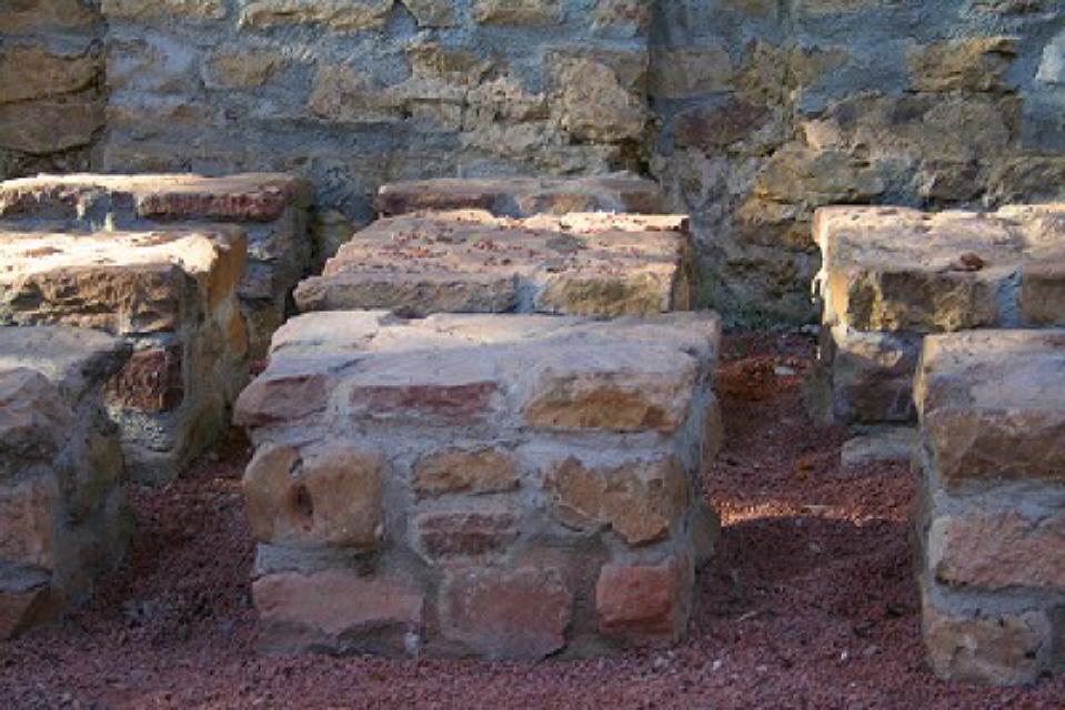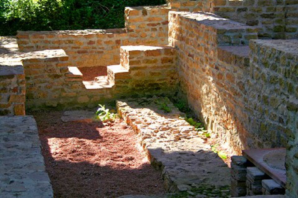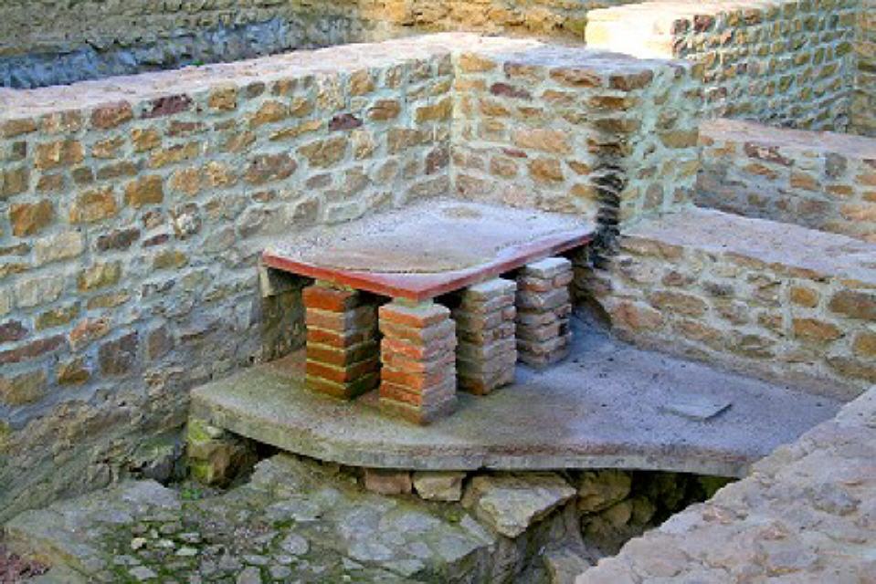 Der kleine Raum E zeigt noch heute gut erhaltene Reste einer Auskleidung und von Estrich, sodass es sich hier um eine Wanne für Kaltbäder gehandelt hat. Das Wasser konnte durch einen Mauerdurchbruch abfließen und spülte dabei noch die Toilette G. Nach erfolgtem Badegang konnte man sich noch ausgiebig auf der Sonnenterrasse H entspannen, während das Bedienungspersonal im Raum F, dem Heizraum, neidisch nach draußen blickte.