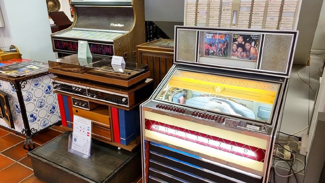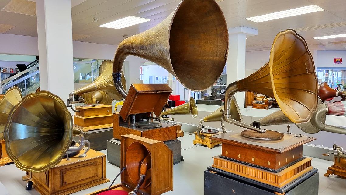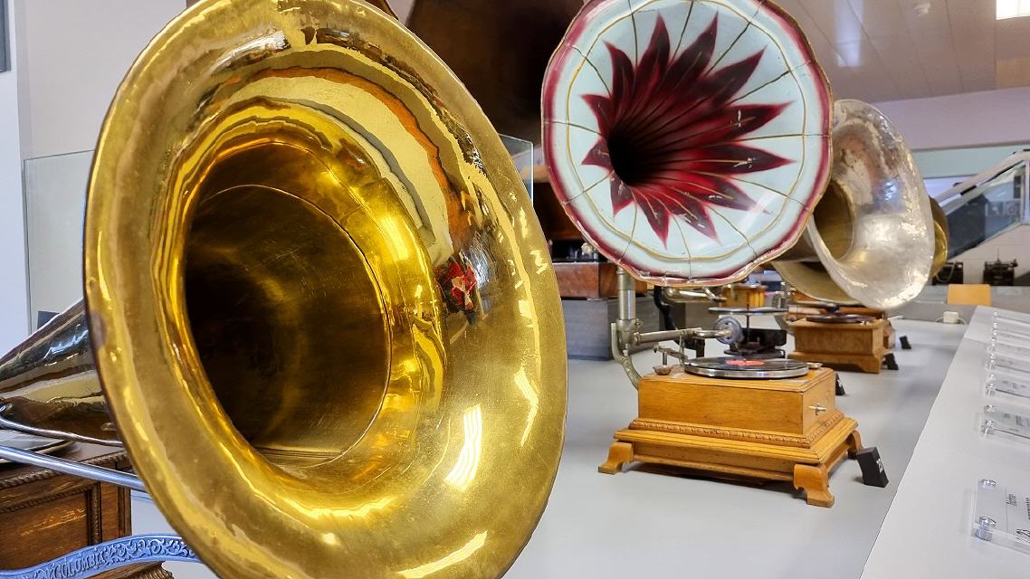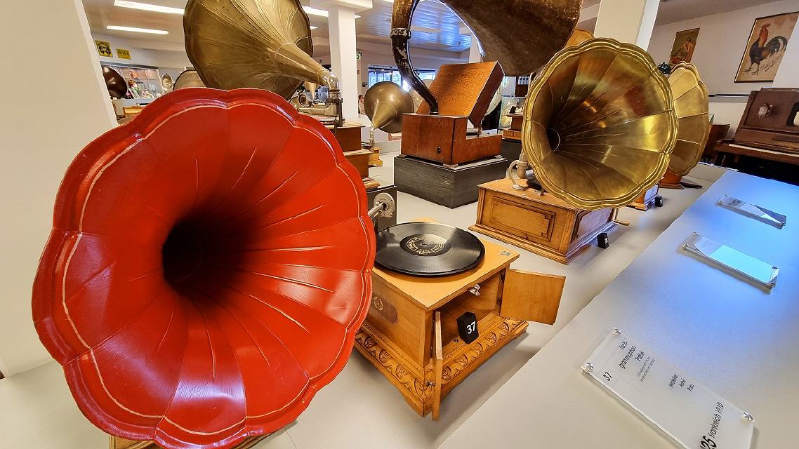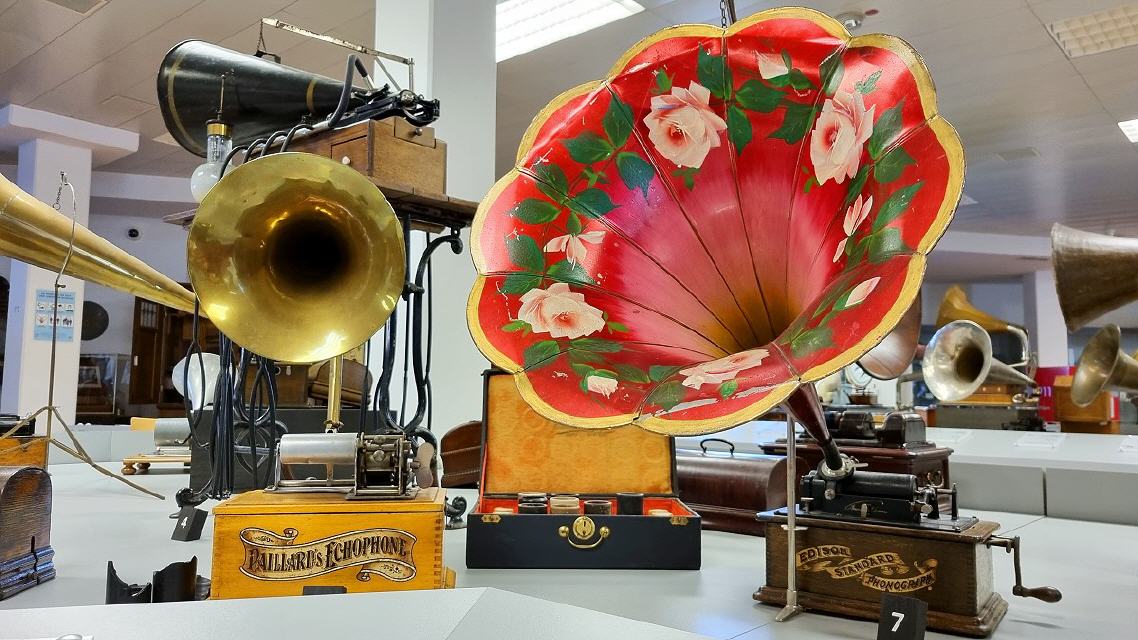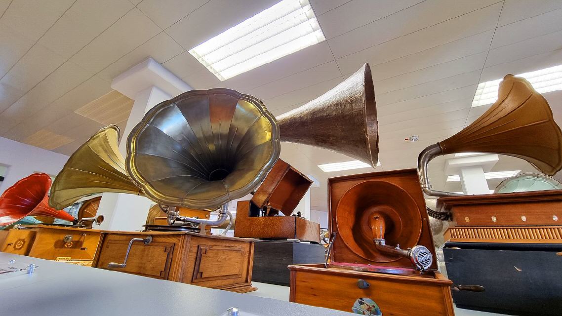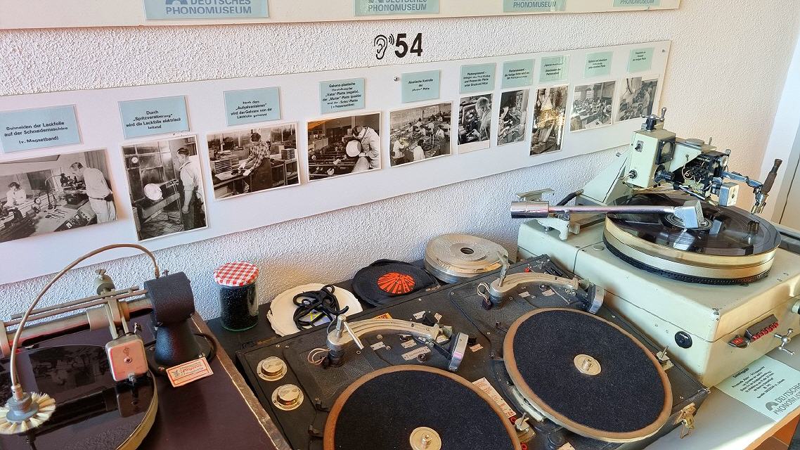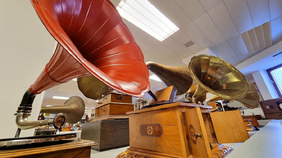 Mit diversen Phonographen, Trichter-, Schatullen-, Koffer- und “Salon”-Grammophonen, mechanischen und elektrischen Antrieben, elektrischen Tonabnehmern und deren Wiedergabegeräten, Plattenwechslern für Schellacks, dem “Ur”Tefifon, Musikbox, Phono-Koffern, den ersten HiFi-Stereoanlagen bis zu den High-Tech-Plattenspielern der 1980er Jahre und deren “Überkopf” -Demonstration wird die an Kuriositäten reiche Entwicklungsgeschichte der Phono-Technik dargestellt.