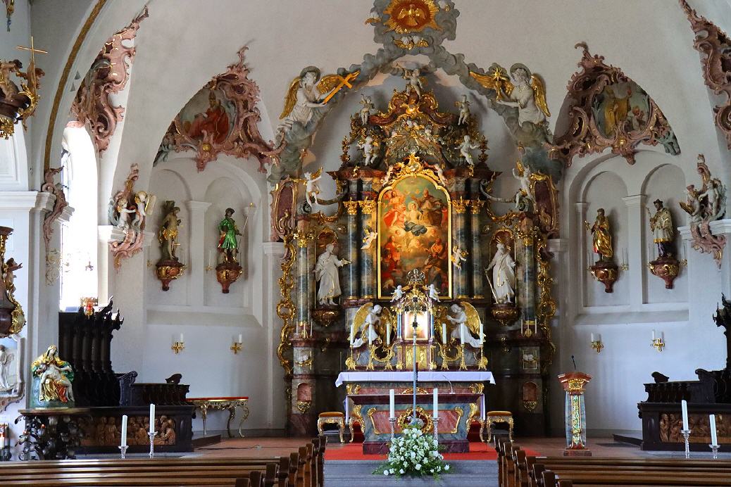 Hervorzuheben sind die Größe der Kirche, die weit über das üblich Maß einer Dorfkirche hinausgeht sowie die prunkvolle Innenausstattung. Die Deckengemälde wurden 1956/1957 von dem Maler Josef Braun aus Wangen im Allgäu geschaffen. Über der Orgelempore zeigt das erste Bild die Geburt Christi in einem zerfallenen Tempel. Diese Darstellung erinnert daran, dass mit Jesu Geburt eine neue Zeitepoche begonnen hat. Im zweiten Deckengemälde ist die Kreuzigung Jesu dargestellt. Unter den Trauernden – farbig hervorgehoben – sind seine Mutter Maria und der Lieblingsjünger Johannes sowie Maria Magdalena. Dargestellt wird auch der römische Hauptmann, von dem überliefert wird, er habe als erster den gekreuzigten Jesus als Sohn Gottes bekannt. Das dritte Deckengemälde stellt die Herabkunft des Heiligen Geistes auf Maria und die Jünger dar, das Pfingstfest. Zeichen für den Heiligen Geist sind die Taube und die züngelnden Flammen (Feuerzungen).