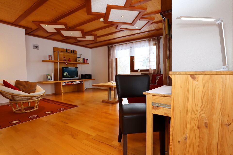 - Wohnzimmer: geräumig, separate Leseecke, gemütliche Couchgarnitur, Tisch, Regalwand, Flachbild-TV, Radio / CD-Player, Schreibtisch mit Leselampe und Stuhl, Zugang zum Balkon