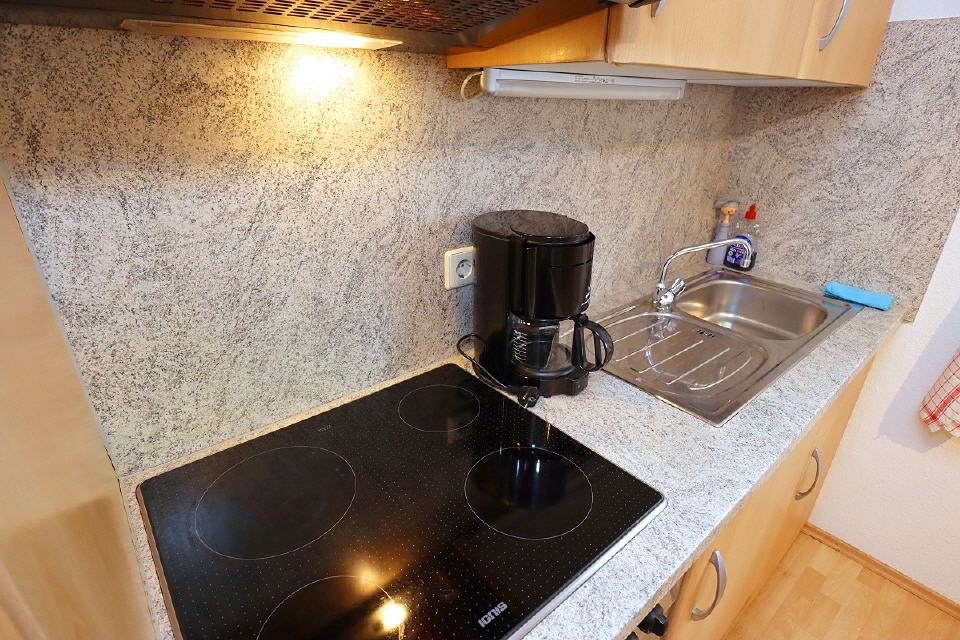 komplett ausgestattete Küche mit Essecke, Herd, Mikrowelle