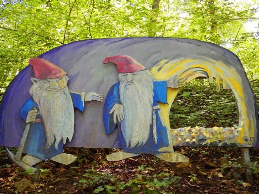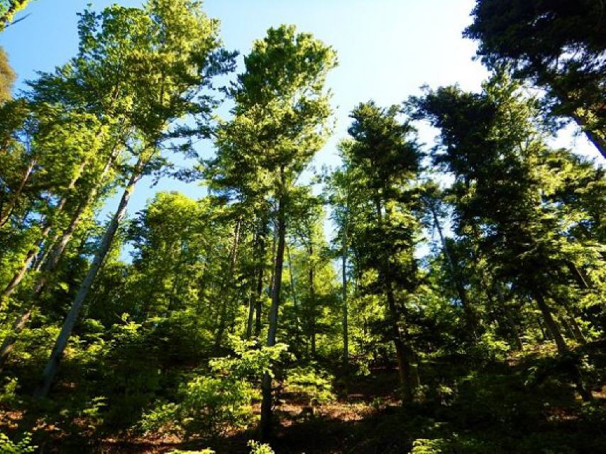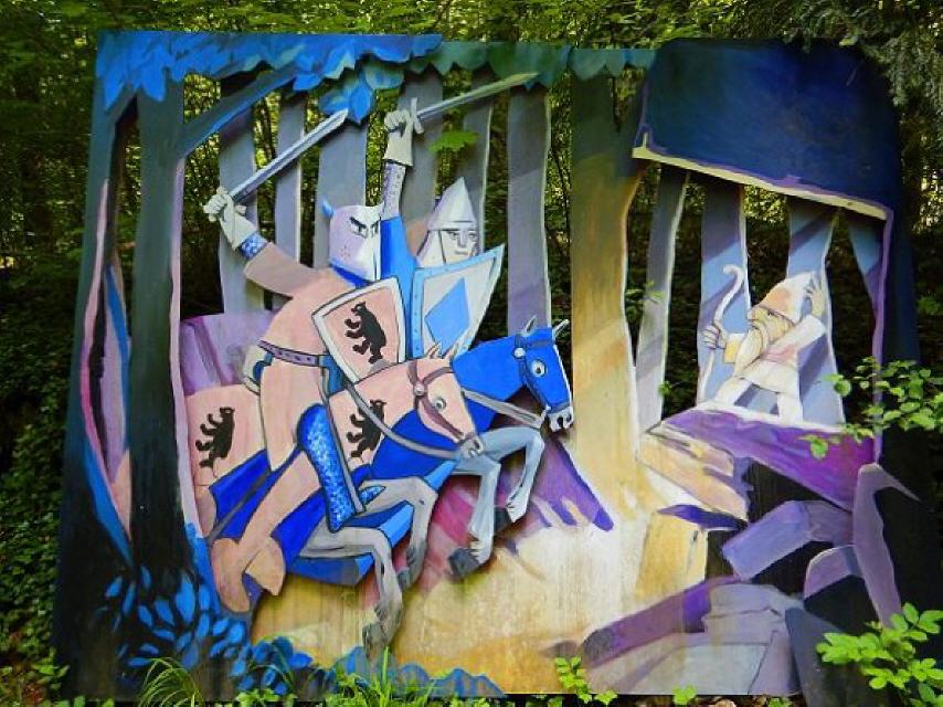 Nach einer kurzen Pause geht es von der Ruine weiter nach Osten durch das Neubaugebiet hinauf zum Hotzenwald. Folgen Sie hier der weiß-blauen Raute. Etwa 100 Meter nach dem Waldrand und nachdem Sie die letzten Wiesen hinter sich haben links der gelben Raute folgen (Lindweg / Naturlehrpfad) und weiter in Richtung Bärenfels. Bald kommen Sie an der 350 Jahre alten Traubeneiche vorbei. Dort ist ein Stand mit Informationen über den Minnesänger Walther von Klingen.
