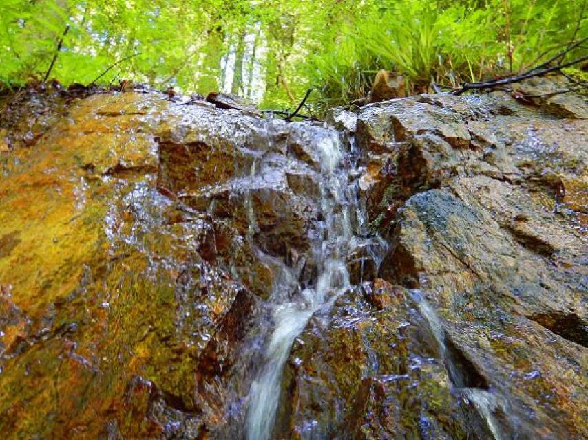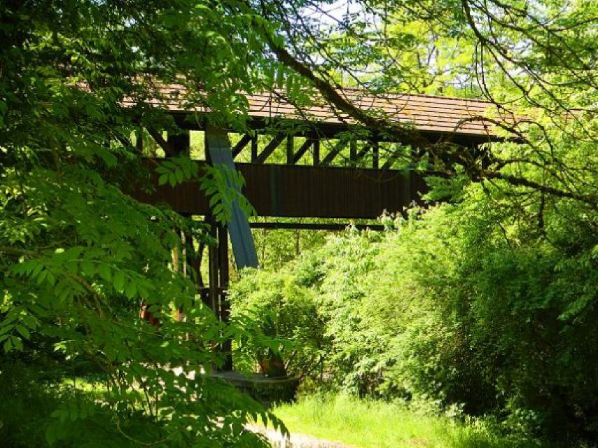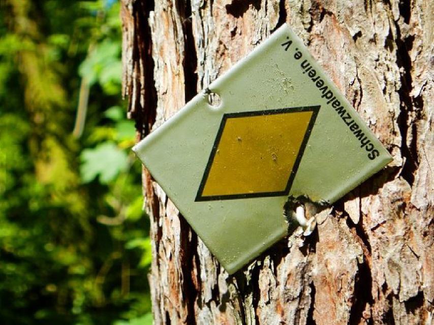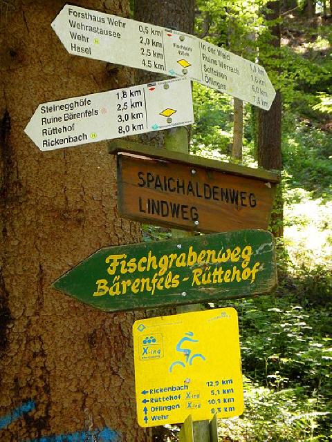 Nach Einmündung in den Spaichhaldenweg 30 m bergab, dann am Fischbach hoch 1,7 km bis zur kleinen Brücke. Der Waldweg entlang des Fischbachs zieht sich hin und ist stark ansteigend. Sobald sie die Brücke erreicht haben, tauchen Wegemarkierungen auf, die Sie nicht übersehen können. Von hier aus können Sie einen Abstecher etwa 100 m bis zum Gedenkstgein für die zerstörten Steinegghöfe machen.