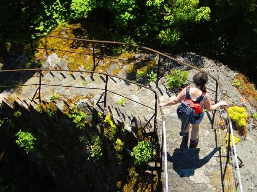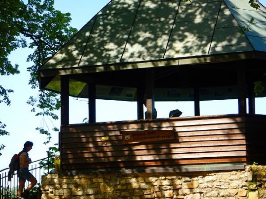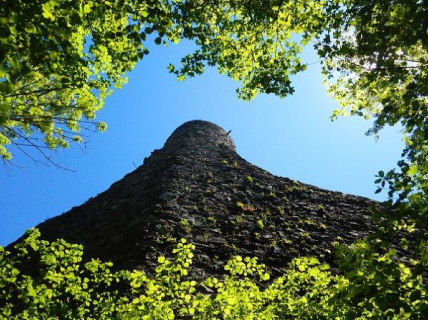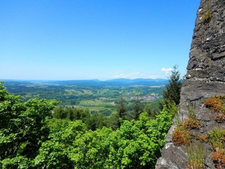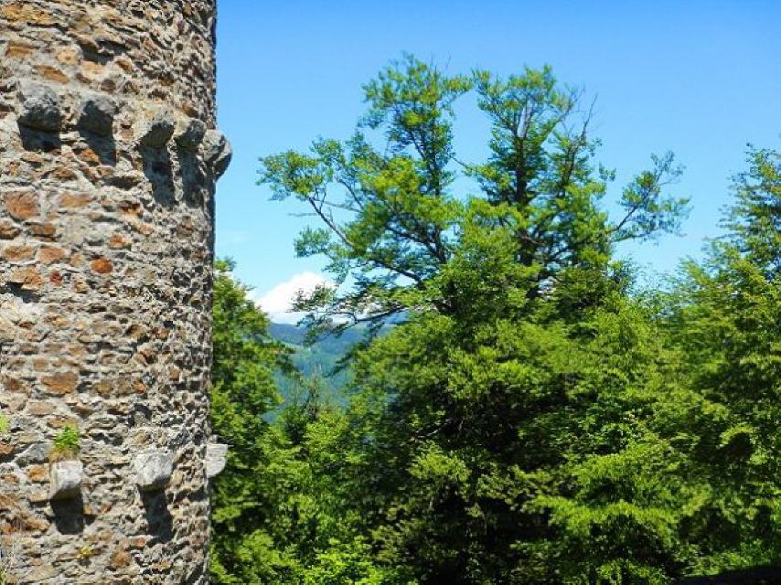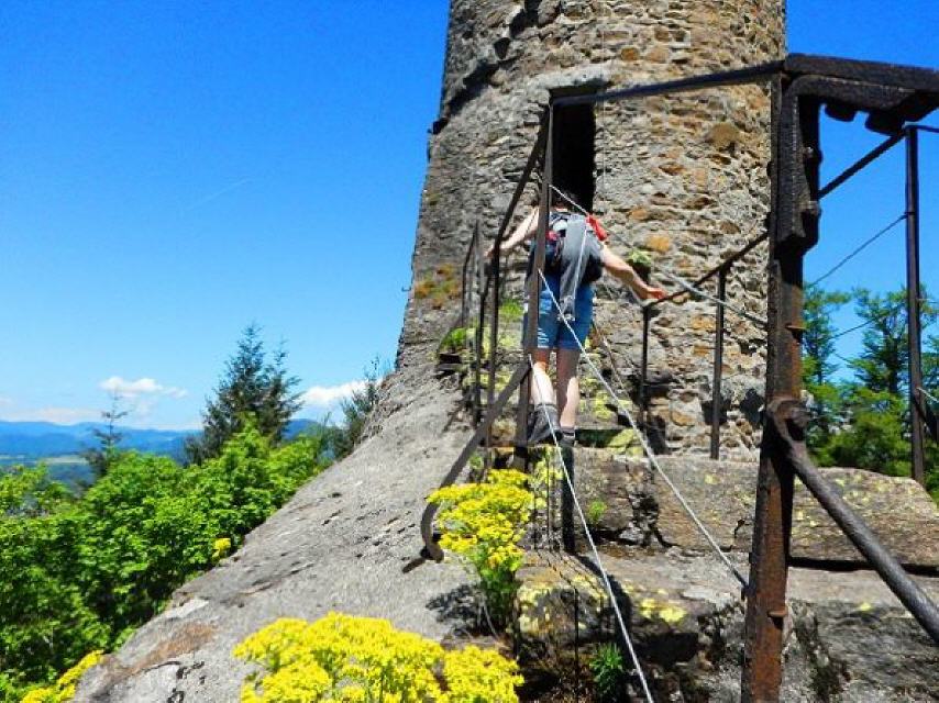 Von der Brücke geht es nun nur noch leicht ansteigend etwa 800 m zur Ruine Bärenfels. Von der ehemaligen Burganlage sind der 16 Meter hohe Bergfried mit seinem Hocheingang in 9 Meter Höhe und einem 6,4 Meter großen Durchmesser sowie Reste einer 3,6 Meter starken Schildmauer erhalten. Legen Sie im schattingen Innenhof ruhig eine Pause ein. Genießen Sie vom zugänglichen Turm das Panorama. Sie erkennen den Wehratalstausee, die Stadt Wehr, aber auch Rheinfelden, den Hochrhein und dahinter die Schweiz, das Wiesental mit Schopfheim, Lörrach und die Burgruine Rötteln.