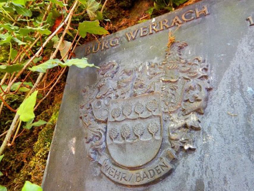Folgen Sie dem Weg zur Wehra, dort flussaufwärts am Ufer bis zum Storchensteg (Holzsteg über die Wehra), rechts hinauf und weiter zur Burgruine Werrach mit dem Sagenpfad. Die Burgruine ist gut ausgeschildert und schon innerhalb weniger Minuten erreichbar; sie liegt im Wald unmittelbar am Stadtrand. Vom überdachten Aussichtsturm haben Sie einen schönen Blick über Wehr.