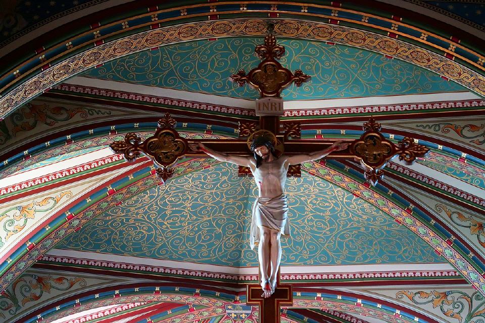 Im Chorbogen hängt ein Triumphkreuz aus der zweiten Hälfte des 19. Jahrhunderts, das Anklänge an romanische und gotische Kruzifixe aufweist. Wie in der Romanik wird Christus als König dargestellt. Er trägt einen Heiligenschein und wird auf Gemälden der Bogenwand von zwei Engeln flankiert, die Zepter, Reichsapfel und eine Krone in ihren Händen halten. An den Kreuzenden sind die Evangelistensymbole als Reliefs angebracht. Andererseits wird Christus mit seiner Dornenkrone und in Gestalt des Dreinageltypus als Leidender gezeigt, wie es erst in der Gotik geschah.