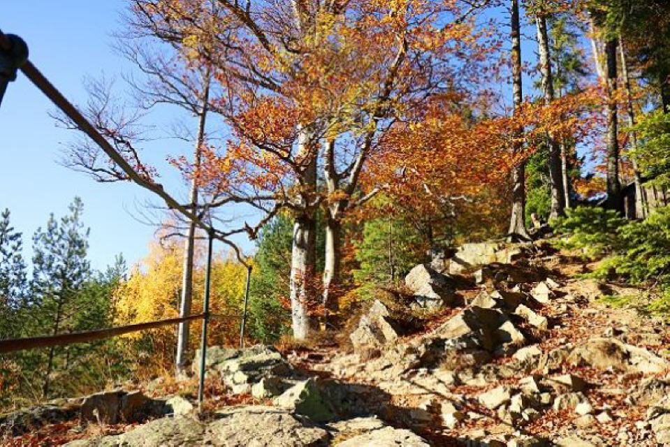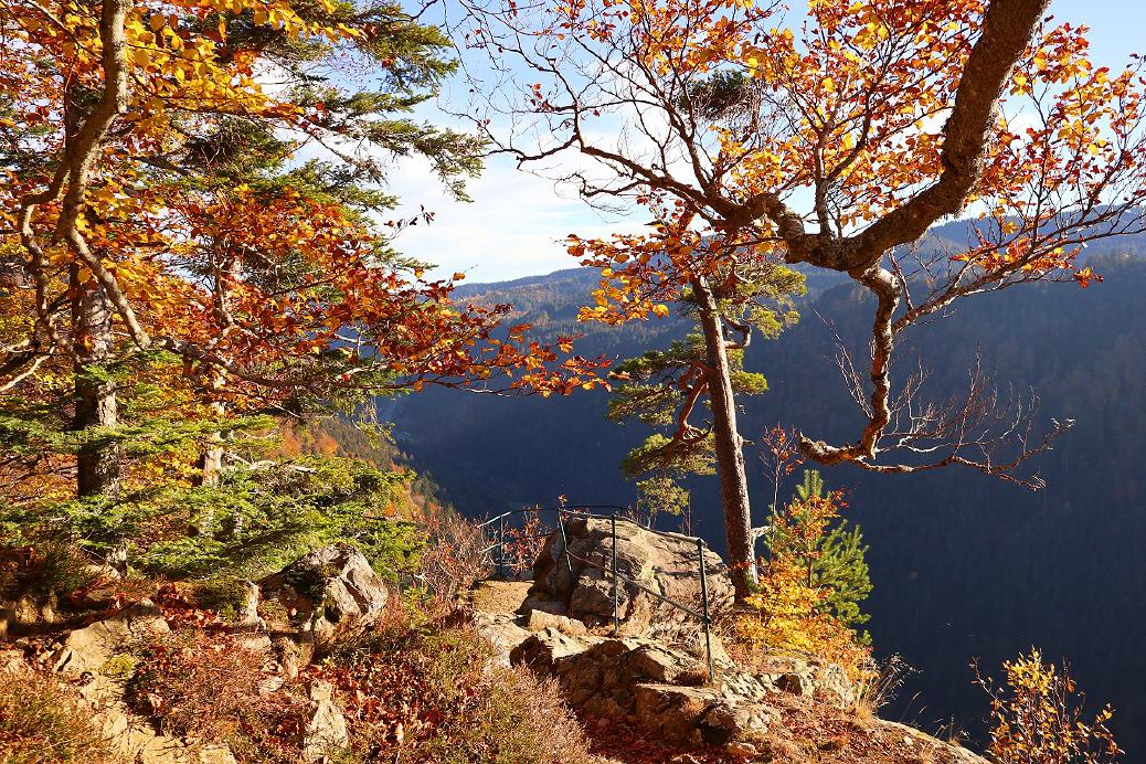 Weiter geht es leicht abwärts nach Westen in Richtung Buchenbach – Himmelreich und passieren den Hirschsprung. Vom Höhenweg aus ist er leider nicht zu sehen. Der Hirschsprung verdankt seinem Namen einer Sage. Demnach begab sich der Ritter der Burg Falkenstein auf Hirschjagd. Nach einiger Zeit entdeckte er einen prachtvollen Hirsch, doch dieser, getrieben von Todesangst, entkam dem Jäger mit einem gewaltigen Satz über die Schlucht. Damals war die Schlucht an dieser Stelle nur neun Meter Breit; im Zuge des Straßenbaus wurde die Engstelle später vergrößert. Die größte Erweiterung wurde schon 1638 von 2000 französischen Soldaten gemacht.